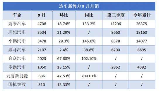 Since the Q2 quarter, Weilai and Ideal have achieved positive gross profit margins and started to have certain profitability. At the beginning of October, a number of new self-manufacturing forces posted orders. In the third quarter, Weilai took the lead in selling over 10,000. The zero running car, which was established less than 4 years ago, also sold more than 1,000 a month for the first time in September.