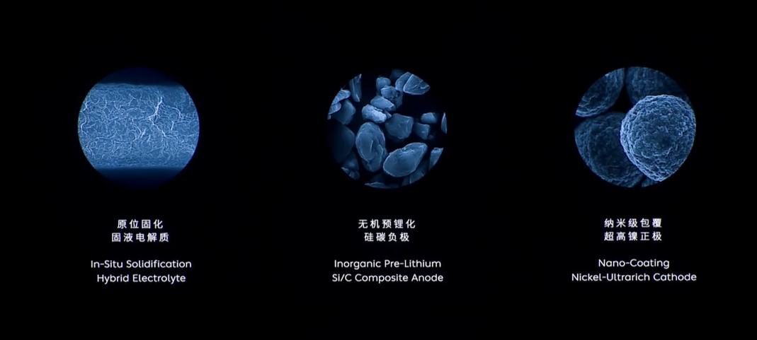 Li Bin introduced that the 150-degree battery pack adopts solid-liquid electrolyte with in-situ curing process, silicon-carbon anode with inorganic pre-lithiation process, and ultra-high nickel cathode with nano-scale coating process, which guarantees the life span while the energy density rises. Improved charging efficiency.